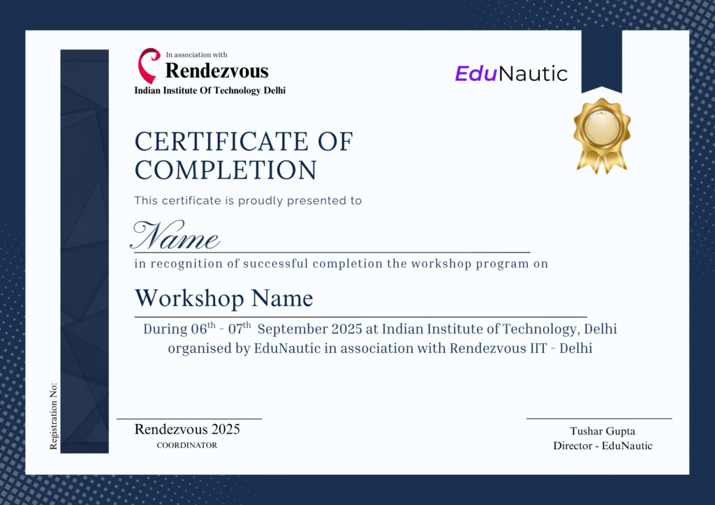 Join Us For The Workshop Series at IIT Delhi In Association with Rendezvous of IIT Delhi 6 Hours of On Campus-Training Practical Knowledge from Industry Expert Recognized Certificate from Rendezvous of IIT Delhi Q&A Session with Industry Expert On - campus Workshop Seriesat IIT Delhi Workshops On Saturday, 06 September 2025 Invest With AI: Using AI-Powered Trading Learn to Invest Smarter with AI Fee ₹ 3499 + 18% GST Workshop Duration 1 Day (From 10:30 AM To 05:30 PM) Learn More Register Now Workshops On Sunday, 07 September 2025 ChatGPT & AI Tools for Healthcare Professionals Empowering Healthcare with the Intelligence of AI Fee ₹ 3499 + 18% GST Workshop Duration 1 Day (From 10:30 AM To 05:30 PM) Learn More Register Now Who is this Workshop For ? Totally versatile – Our Courses at IIT Delhi ranges from Basic to Advanced. Students Professionals Job Seekers Tech Enthusiasts Professionals Students Job Seekers Tech Enthusiasts Train Yourself with Growth Skills that have helped over 10,000+ Students in the Past Years. Book Your Seat Today Benefits of this Workshop Get Certificate from Rendezvous 2025, IIT Delhi in Association with Edunautic Certification in association with Rendezvous, IIT Delhi. An edge over the rest in the highly competitive job market. Interaction and Networking with Like-Minded people at IIT Campus. Workshop Details Participants can Register for multiple workshops Saturday, 06 September 2025 Invest With AI: Make Your First AI-Powered Trade Sunday, 07 September 2025 ChatGPT & AI Tools for Healthcare Professionals Seats are limited and filled on a first-come, first-serve basis! Don’t miss this exclusive chance to join interactive workshops at IIT Delhi for a hands-on learning experience. The Workshop Series is being organised in association with Rendezvous, IIT Delhi. IIT Delhi faculty is not involved, either directly or indirectly. Notice: JavaScript is required for this content.